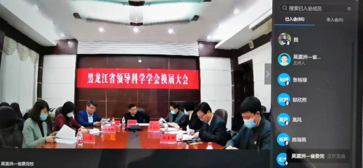 2021年1月15日,黑龙江省领导科学学会在省委党校(省行政学院)以线上线下结合的方式召开换届大会。省委党校(省行政学院)副校(院)长韩健鹏出席会议并致辞,领导科学教研部主任李军、社会和文化教研部主任高原丽、党史党建教研部副主任孙昭、社会和文化教研部副主任赵春辉、领导科学教研部学科带头人李素艳等教师代表在省委党校(省行政学院)教学综合楼512室参加会议。省社科联学会部部长曹妍以及哈尔滨工业大学、东北林业大学、黑龙江大学、全省党校系统等从事或关注领导科学研究的专家学者共80余人在线参加会议。会议由孙昭主持。