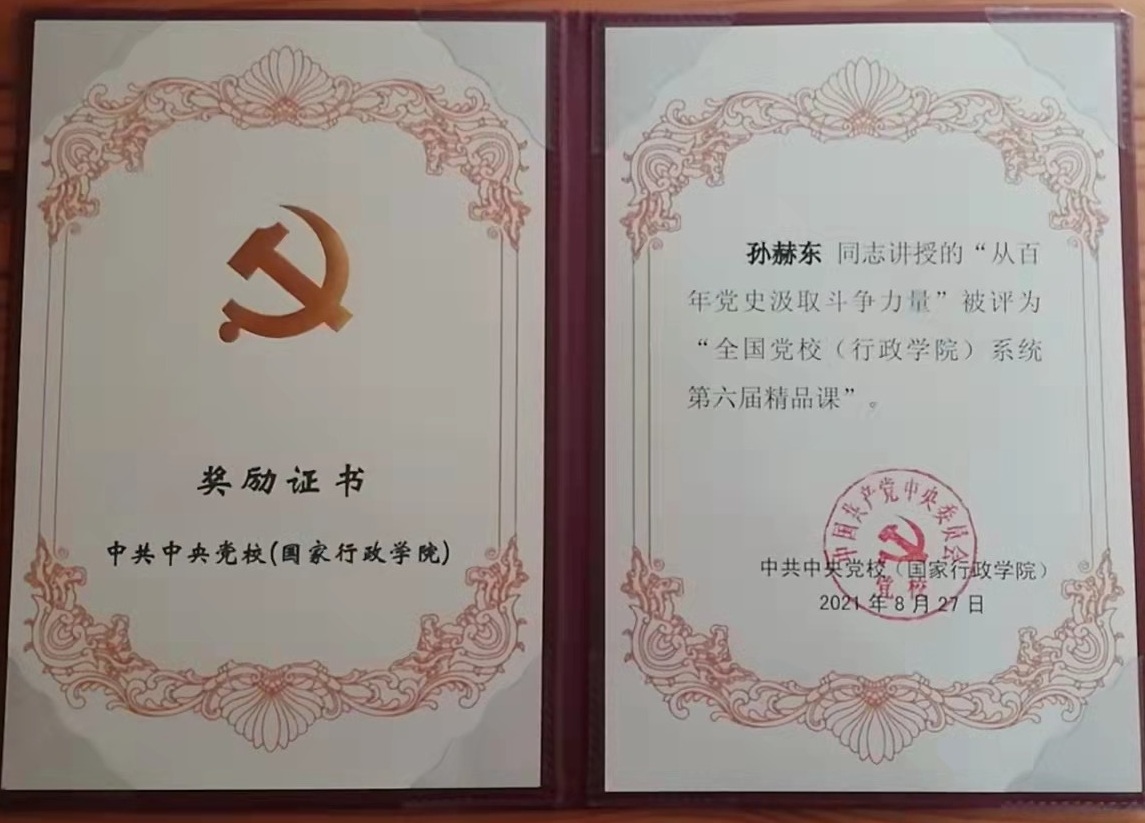 中共党史党建教研部副主任、副教授孙赫东讲授的课程《从百年党史汲取斗争力量》在全国党校(行政学院)系统第六届精品课和第五届教学管理优秀奖评选活动中被评为“全国党校(行政学院)系统第六届精品课”。