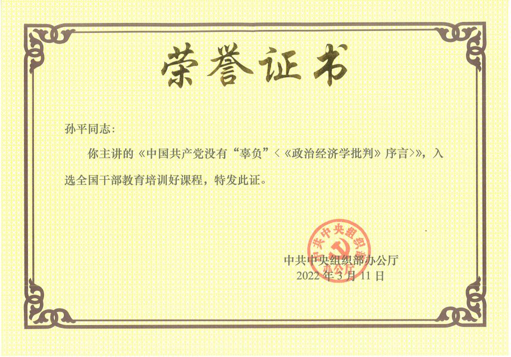 经济学教研部副教授孙平讲授的课程“中国共产党没有‘辜负’《<政治经济学批判>序言》”入选2021年度中组部全国干部教育培训好课程。